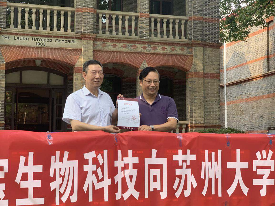 現場,王翼寧將所捐贈的消毒產品交給了蘇州大學的代表周高。周高接收了物資,并對乾寶生物科技表示了感謝,同時向企業頒發了捐贈證書。