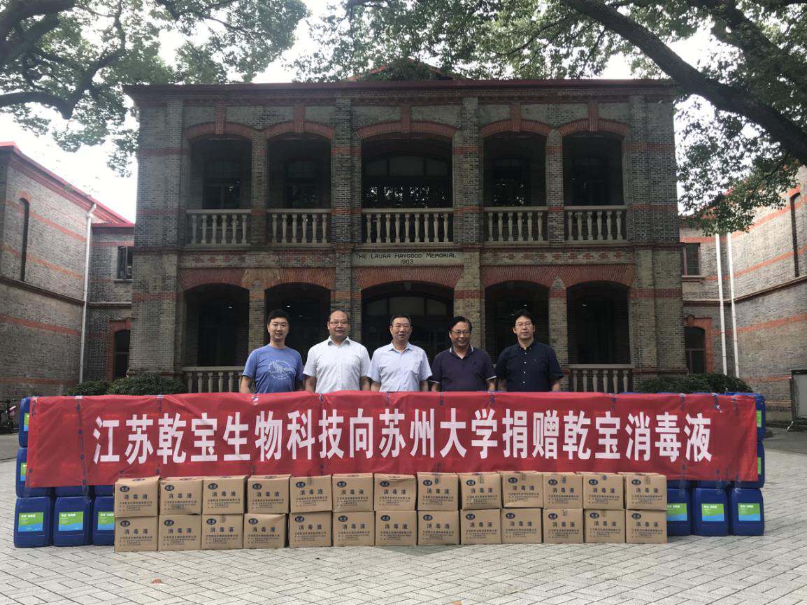 開學季來臨,高校疫情防控受到各界廣泛關注。為幫助高校做好常態化疫情防控,有序開展新學期防疫工作,2020年9月4日,愛心企業江蘇乾寶生物科技有限公司向蘇州大學捐贈了255桶20L裝乾寶安全環保消毒液和1650瓶300mL裝消毒噴霧,共計5噸,全力保障學校的校園環境衛生和師生的健康安全。蘇州大學黨委副書記劉標,黨委常委、總會計師周高,后勤管理處處長王云杰以及江蘇乾寶集團總裁王翼寧、江蘇乾寶生物科技總經理助理姚志光參加捐贈儀式。