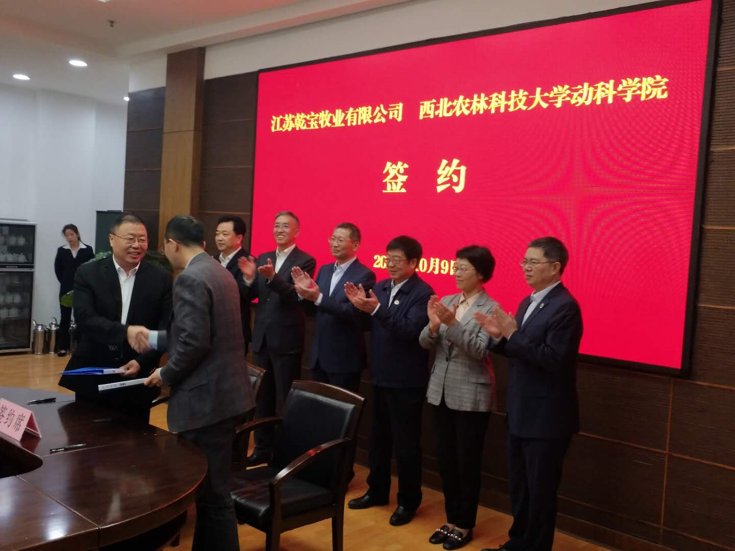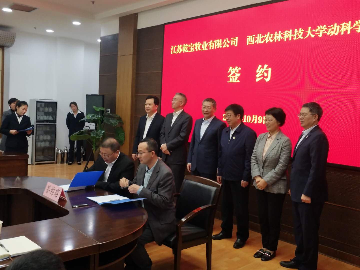 為加強(qiáng)和深化校地與校企合作,充分發(fā)揮地方政府、高校與企業(yè)各自優(yōu)勢(shì),協(xié)同推進(jìn)創(chuàng)新成果轉(zhuǎn)化和產(chǎn)業(yè)創(chuàng)新發(fā)展,同時(shí)促進(jìn)校地和校企合作培養(yǎng)人才,10月9日上午,鹽城市委書(shū)記、人大主任戴源同志率領(lǐng)鹽城市農(nóng)業(yè)龍頭企業(yè)代表團(tuán)赴西北農(nóng)林科技大學(xué)考察,并舉行校地科教合作座談會(huì)暨簽約儀式。江蘇乾寶科技發(fā)展集團(tuán)有限公司董事長(zhǎng)、江蘇乾寶牧業(yè)有限公司董事長(zhǎng)王躍程、總經(jīng)理蔣柏林隨團(tuán)參加了考察和簽約活動(dòng)。王躍程董事長(zhǎng)代表公司與西北農(nóng)林科技大學(xué)動(dòng)物科技學(xué)院簽訂了合作協(xié)議。