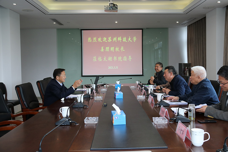 3月31日上午,蘇州科技大學校長姜朋明到訪江蘇省研究生工作站太湖書院。太湖書院山長丘亮輝,江蘇乾寶科技發展集團執行總裁、太湖書院秘書長王翼寧,江蘇省研究生工作站的研究生導師負責人、太湖書院執行院長王建明,常務副院長、江蘇省研究生工作站的書院負責人丘東等人熱情接待并參加座談。