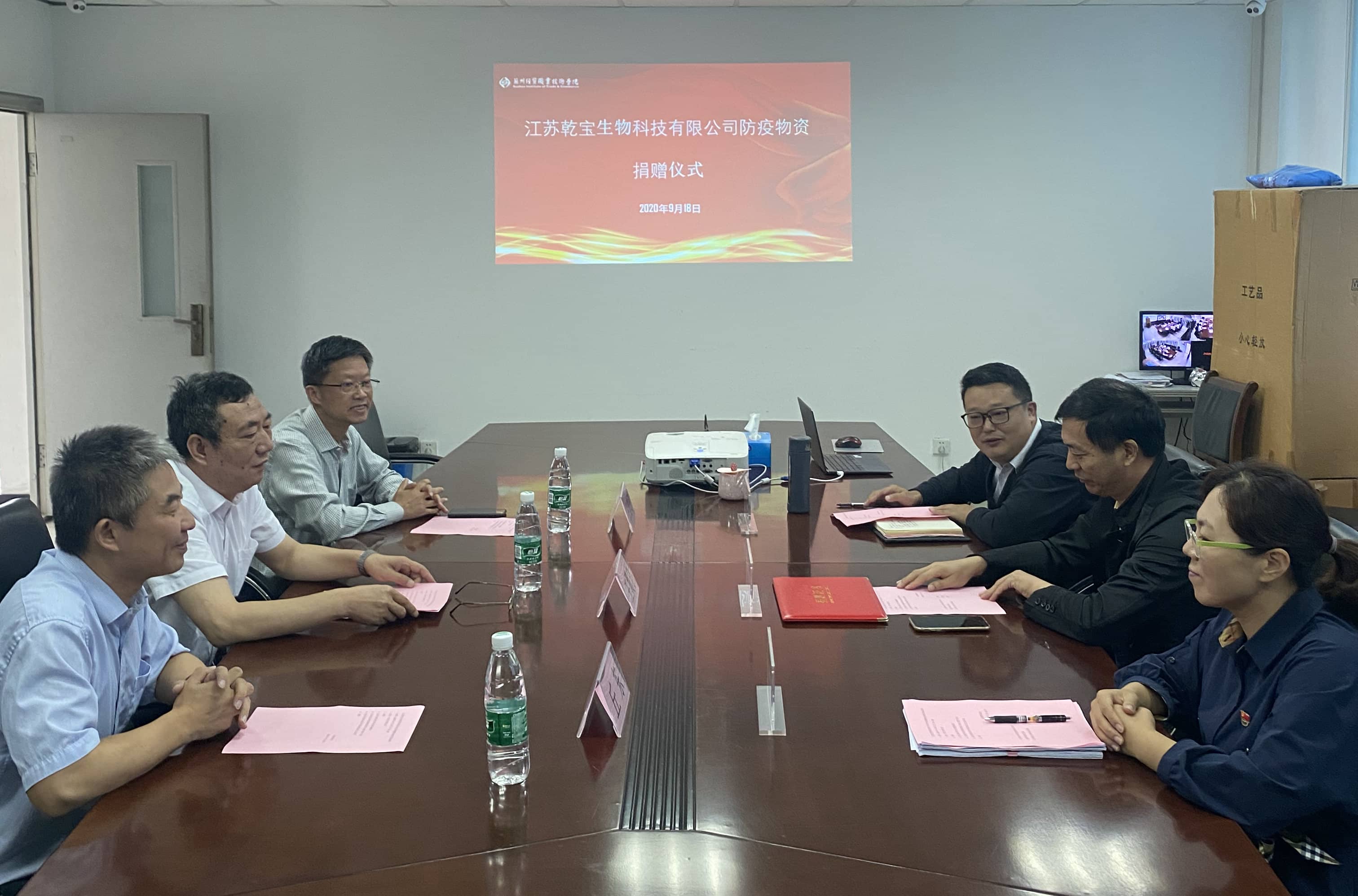 2020年9月18上午江蘇乾寶生物科技有限公司(簡稱“乾寶生物科技”)防疫物資捐贈儀式蘇州經貿職業技術學院行政樓舉行江蘇乾寶集團總裁王翼寧、江蘇乾寶生物科技有限公司總經理丘東、太湖書院執行院長王建明、蘇州經貿職業技術學院副院長沈文其、后勤管理處處長蔡達君、后勤管理處科長陸體艷出席了捐贈儀式。蔡達君處長主持了捐贈儀式,并介紹了出席儀式的嘉賓。